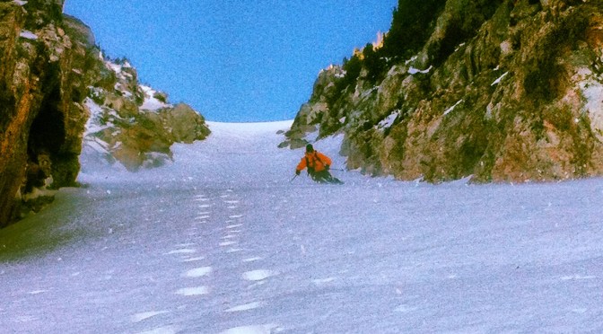 We skied down to the entrance of the couloir and decided on skiing it in three sections, with two stops at relatively protected points along the skiers right of the couloir. I dropped in first, making some “powder” turns on the wind pockets, while they broke apart and funneled down the couloir. I stopped and waited for Dane to make some fun turns down the 50 degree entrance to the couloir.