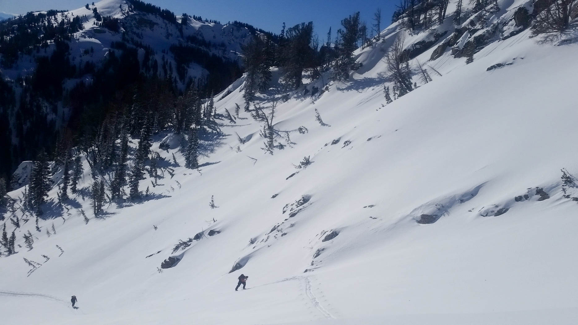 We decided to begin our climb to the lookers left of the “waterfall”, but I think the easiest and safest line up is to the right, through the trees and cliffs. Upon starting up, we heard numerous whomps as the snow collapsed on a weak layer at about 7600′ in elevation. This was very concerning to us and we discussed proceeding or not, but decided that the weak layer was only a low elevation (surface hoar) issue. We continued up cautiously for around 500′, making quick switchbacks on relatively exposed face, maintaining a policy of only one person on the slope at a time. After a stress filled, painfully slow initial hour of climbing, we seemed to be out of danger, having not heard a whomp for 200′ or so. The slope got pretty steep and crusted here, so we took off our skis and shouldered them for another 500′ until we reached the top of the steep initial face. We quickly got back into skin mode and tried to make up some of our lost time as we worked our way up and to the right. We got our first look at the Banana Couloir from up close not long after and were a little concerned at its size and the distance we still had to cover before reaching the top. We worked our way up the left side of the massive couloir for around 500′, before crossing the couloir to the safer, less exposed right ridge.