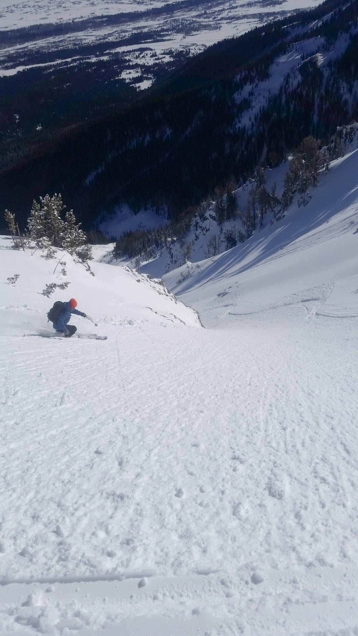 We made great time up the face, making it to the summit just past 1pm, but were all aware that now we had to make it down this large avalanche path safely. We took a few pictures, admired the entry into the “V Notch Couloir” and quickly geared up for the ski.