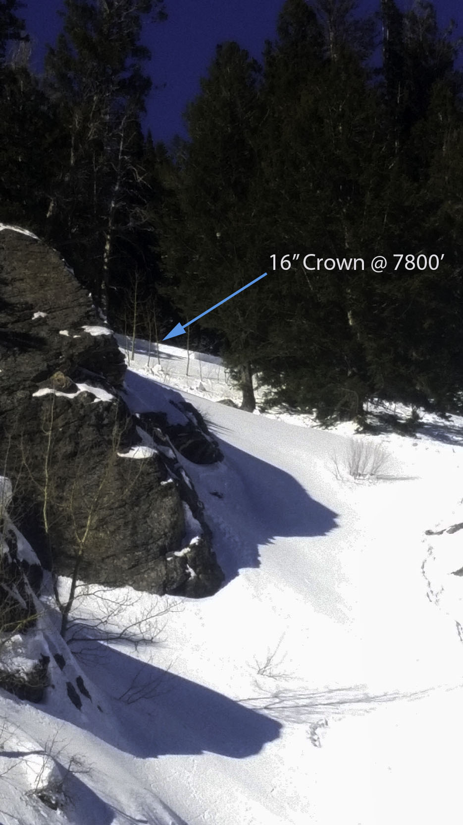 We approached the lower face from skiers left of the waterfall and cautiously made our way down, all to aware of the potential instability the snowpack displayed earlier. We made it down to a cliffband about 200′ from the bottom of the canyon. There were two possible ski throughs and I chose a less exposed ski to the left. I made it down and gave a hoot, signally the next skier should come down to me. All of a sudden, Dane yelled, “Avalanche!”. I moved behind a tree and as I did, looked up and could see snow beginning to flow over the cliff. It didn’t look huge, but saw large blocks of snow from what appeared to be a hard slab rolling over the cliff for what seemed like minutes. When the snow stopped, I could hear someone yelling from below the cliff (to my left) and nothing from above where Dane and Close had just been. I called for Dane again and thankfully heard him yell, “I’m safe, but Close got taken down below!”. I raced down to the debris pile at the bottom of the cliff band and as I approached, saw Close’s pole. My mind was racing, but was going for my transceiver to search for Close when I heard something from above. It was Brian, he had been pulled over a small cliff and thankfully found some way to stop himself from being dragged over the much larger cliff edge a few feet in front of him. He said he was missing his ski and pole, but he was ok. I looked around in the debris pile for a bit and luckily found his ski half buried, but intact.