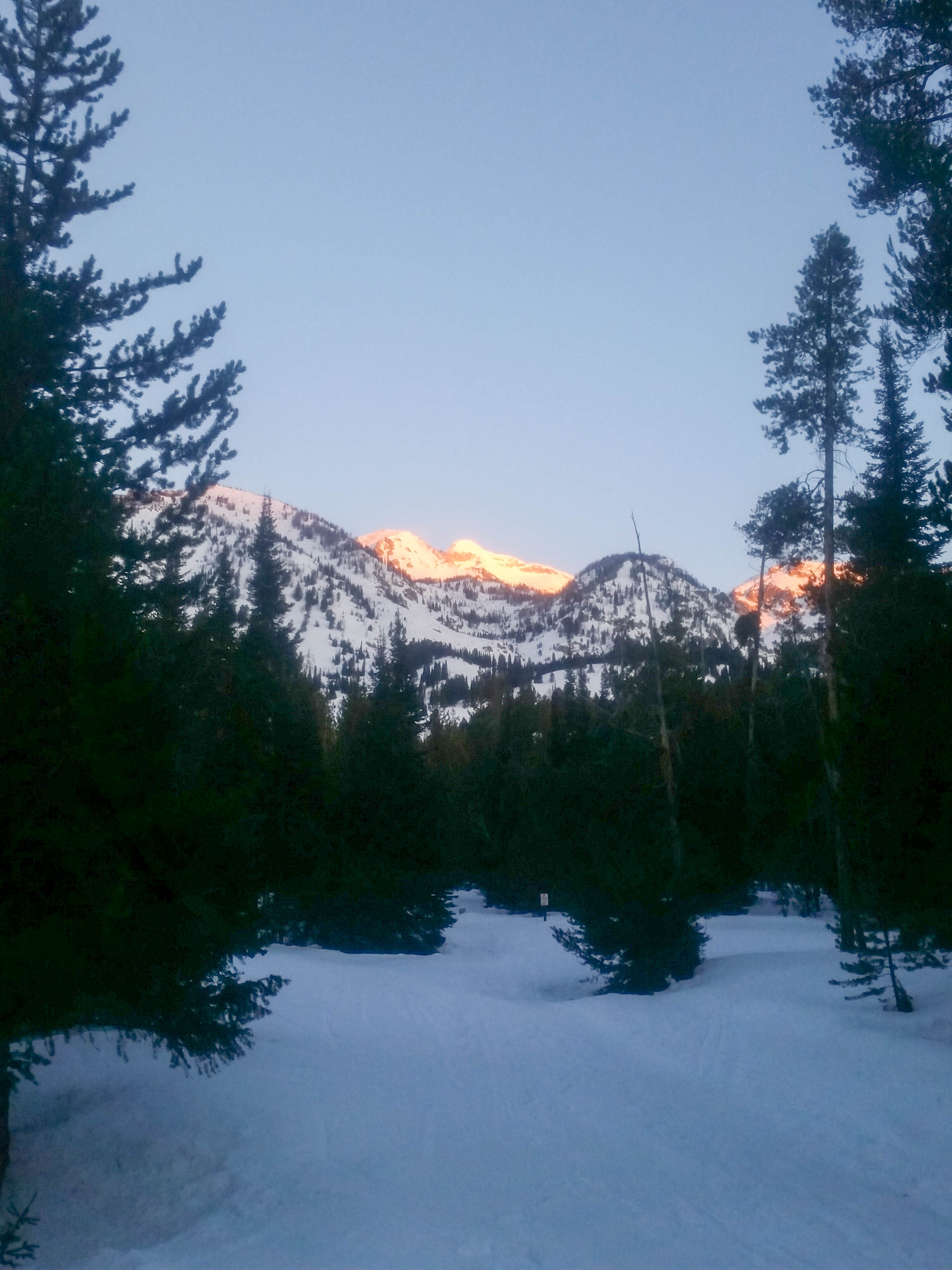 As everyone around the Jackson area knows, the weather has been warm and dry lately. Despite that, we still have a deep snowpack and a low avalanche danger. These combine for primetime opportunities to ski some big lines, if you can get over the fact that more than likely you are not going to be skiing anything resembling powder. So, with this in mind: Dane, Tristan and I chatted Monday night about what to ski the following day. We threw out a bunch of options, but settled on the East Face of Buck Mountain. I have skied it once and attempted to ski it twice, being turned around last spring due to warm snow conditions. We met at 6am and departed for the Death Canyon Trailhead. We were moving at 6:40am and worked our way up the track and towards the turnoff for Whimpys Knob and Albright Peak.