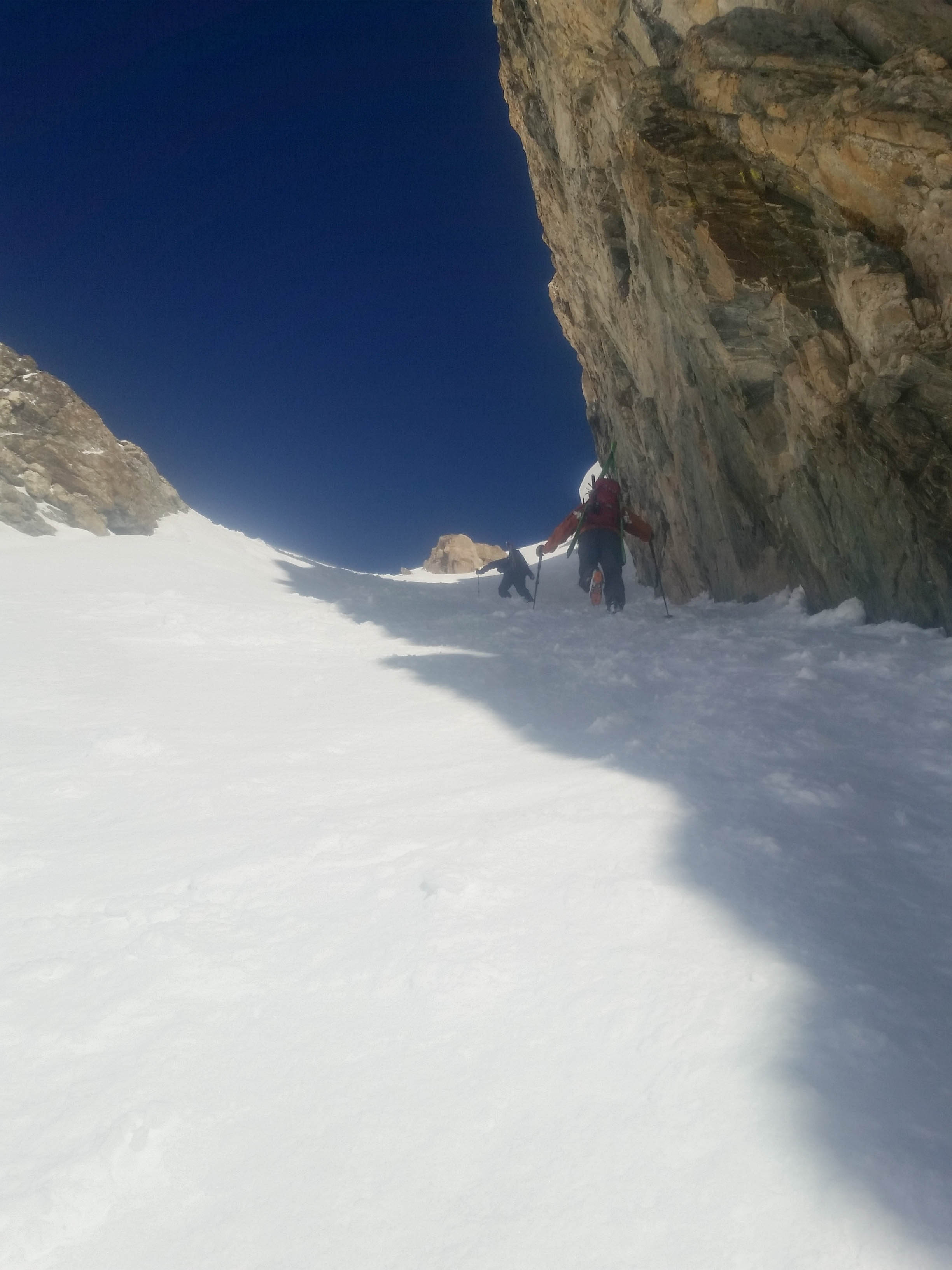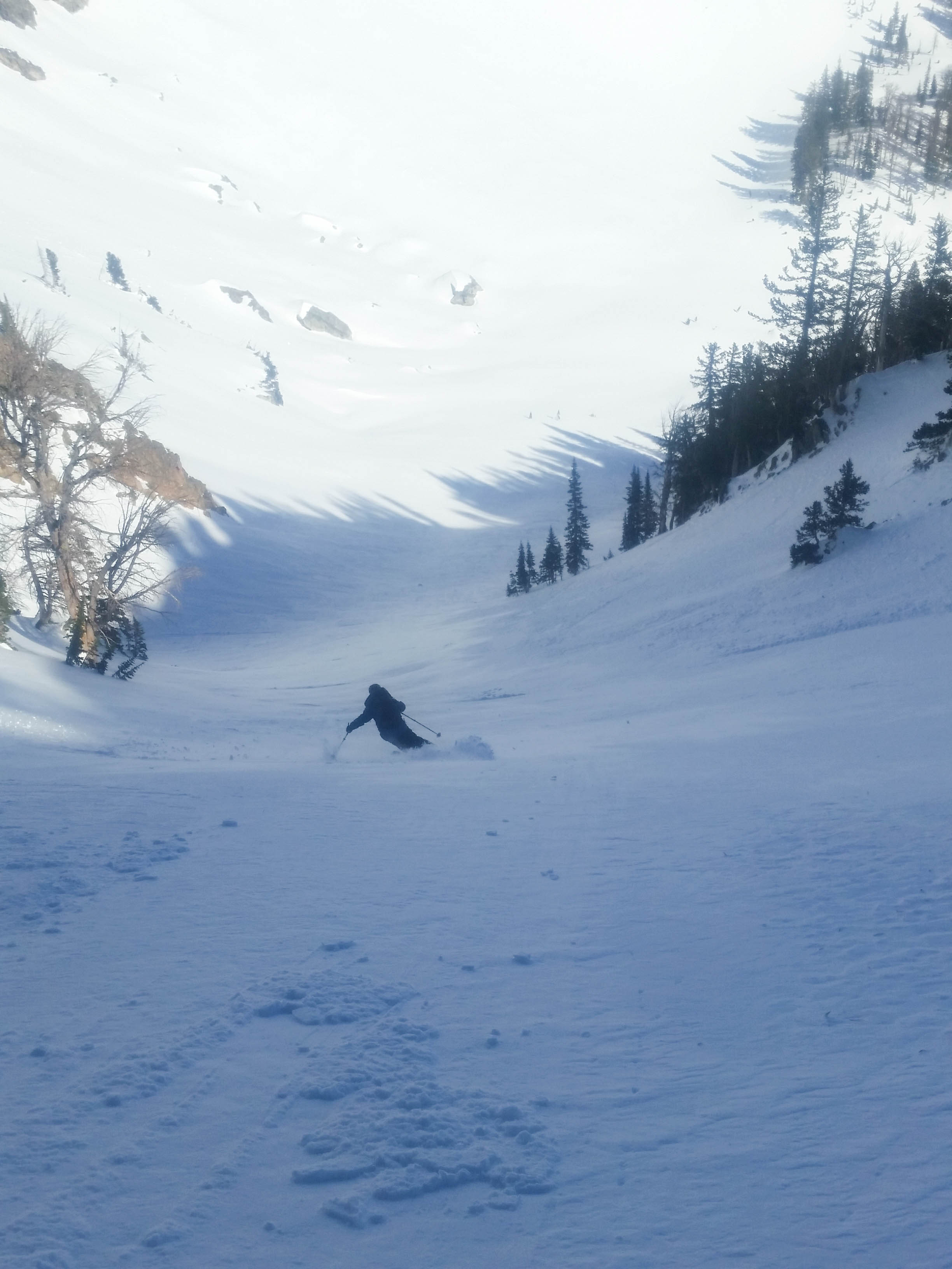 From here, Tristan worked his way down and through the “entry” couloir while Dane and I waited for his hoot to signal he was through. After that, we both worked our way down and through the couloir, being careful not to catch a ski on the many frozen chicken heads littering the zone.
