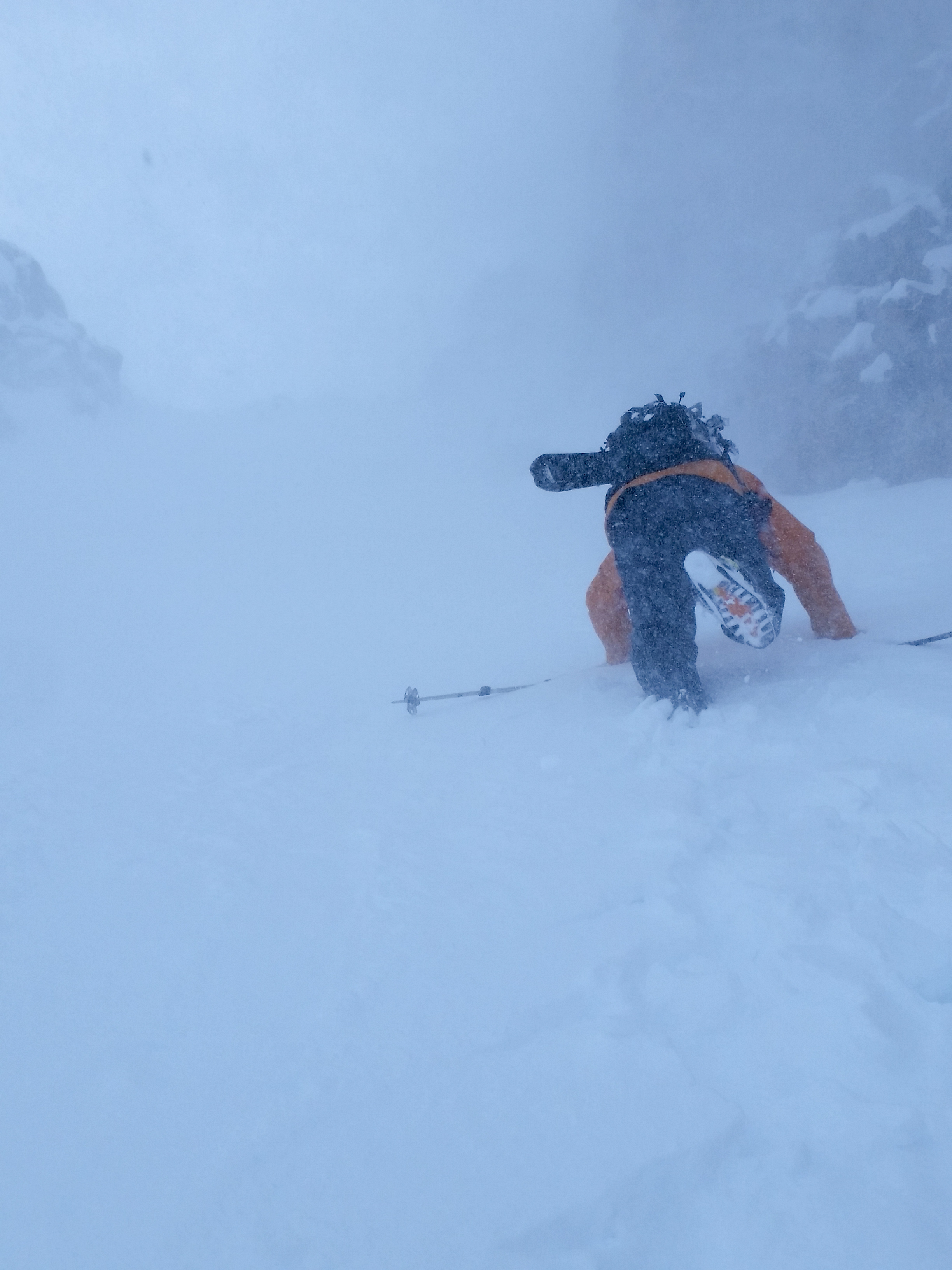 We quickly got ready to ski as the gusts continued to pound us, covering our gear with snow in a matter of seconds. We decided to enter the couloir from the right where we could get a good ski cut on the upper slope to test the stability. With nothing moving, we tentatively made turns down the steep couloir to the first of two tight pinches.