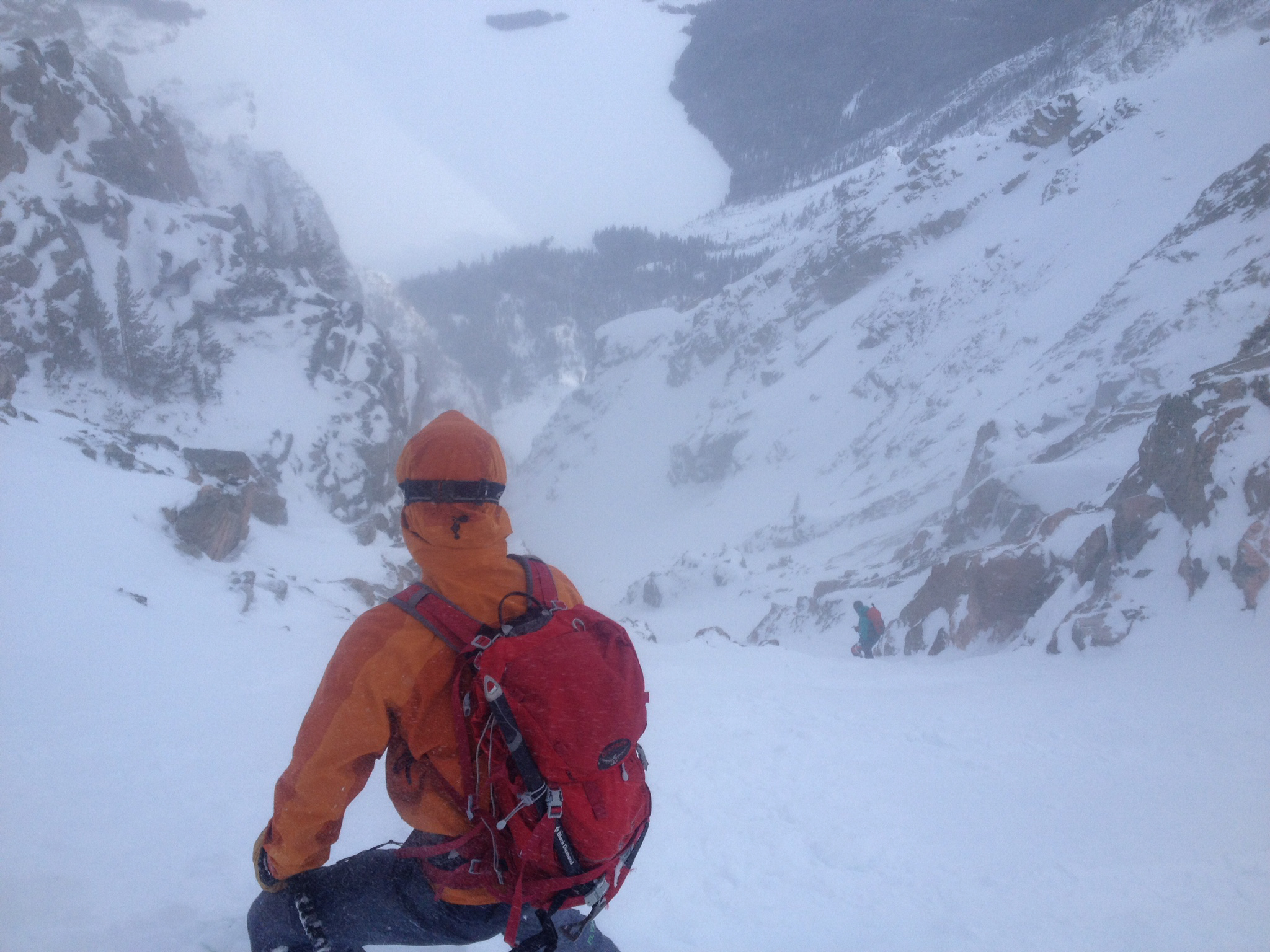 The snow in this section was about 2 feet of powder with a breakable crust below. At times, the crust would support us, but often we would break through to a sugary, faceted layer a foot below. This made the climbing challenging and time consuming. After making it over the “bulge” at the end of the pinch, the couloir opened up into a large mellow middle section.