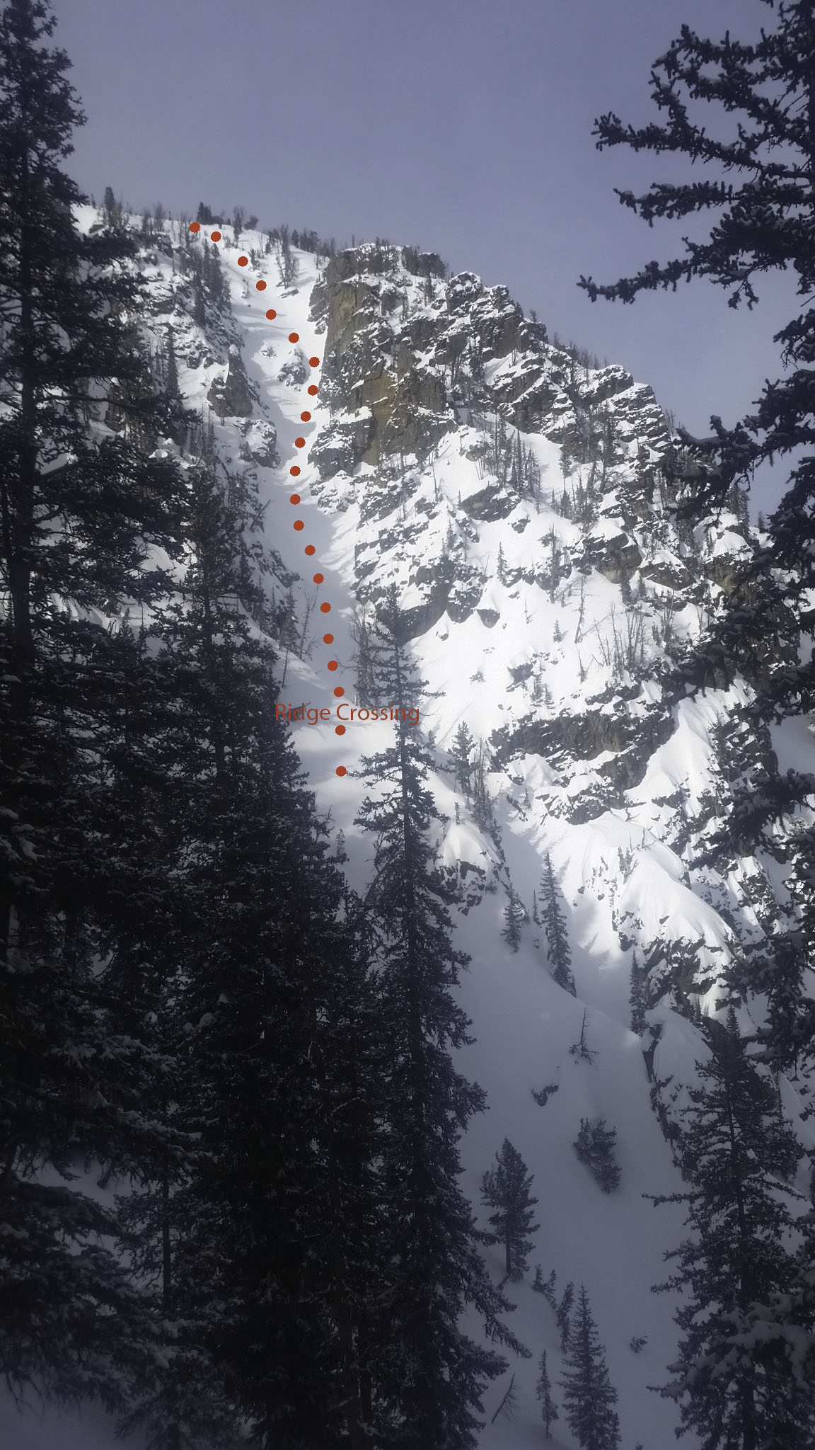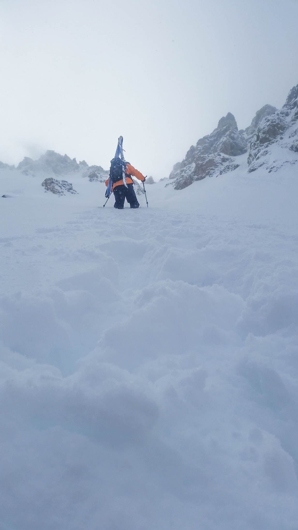 We worked our way up, through some tight growth and eventually found ourselves lookers right of the avalanche path and the “normal” skin up. We crossed the path and continued up the ridge, finding a faint skin track from a few days earlier. The up was fairly easy and we soon found ourselves on the ridge that eventually leads to the Son of Apocalypse. We found the little depression in the ridge we were looking for around 4hrs from leaving the truck. While waiting for the group, I scoped out an alternative entry to the couloir that would provide a lot more spice, but looked doable if the conditions were right.