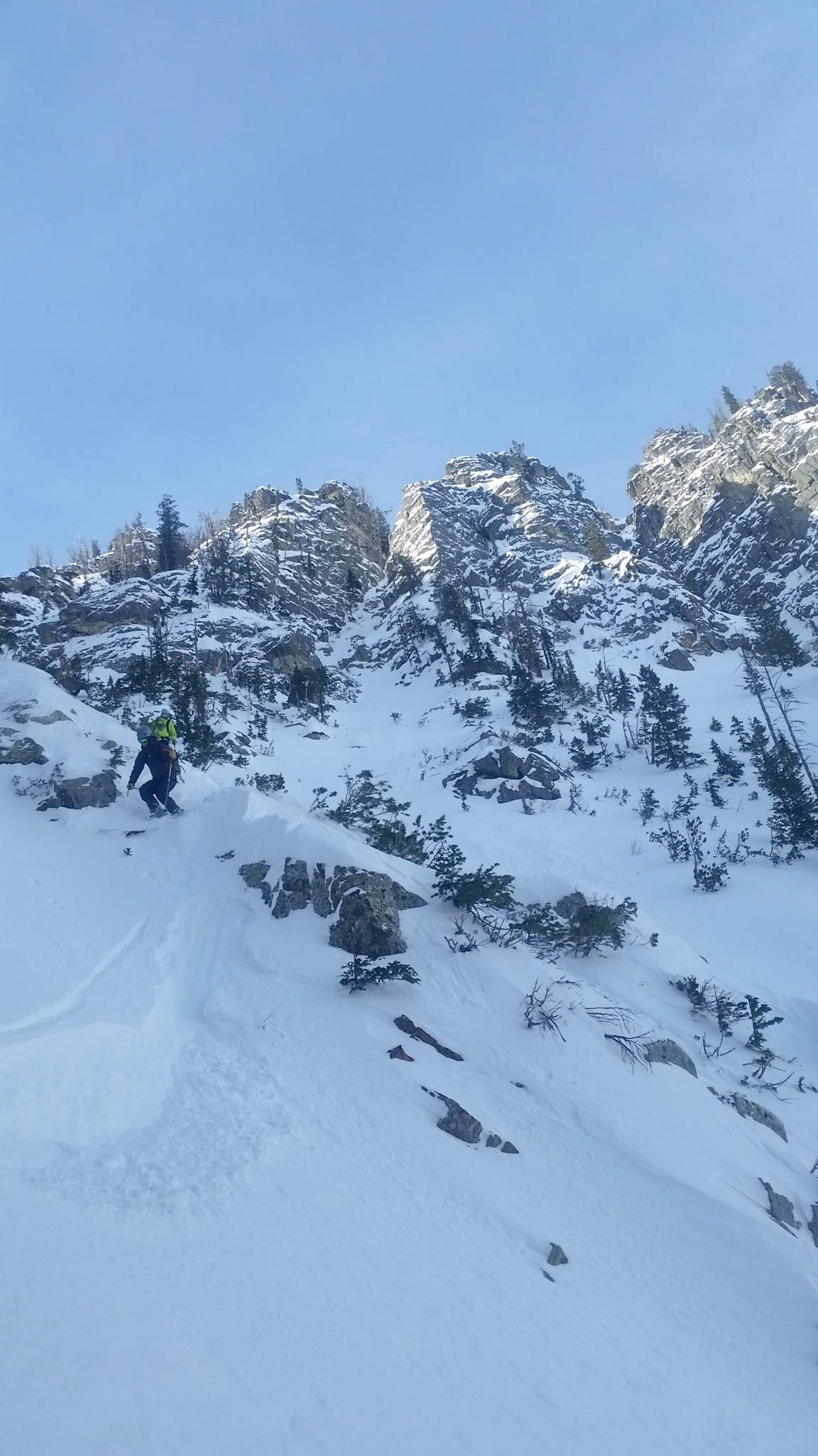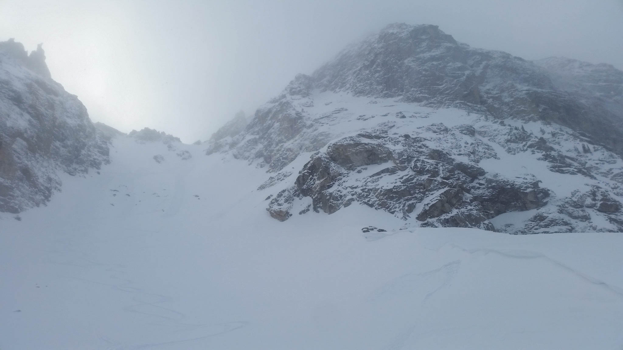 We skied the apron down for a bit and had a look up to Apocalypse Couloir to see if the ice bulge was filled in. We couldn’t determine if it was, but could tell that if it was skiable, it must be about a ski length wide at most.