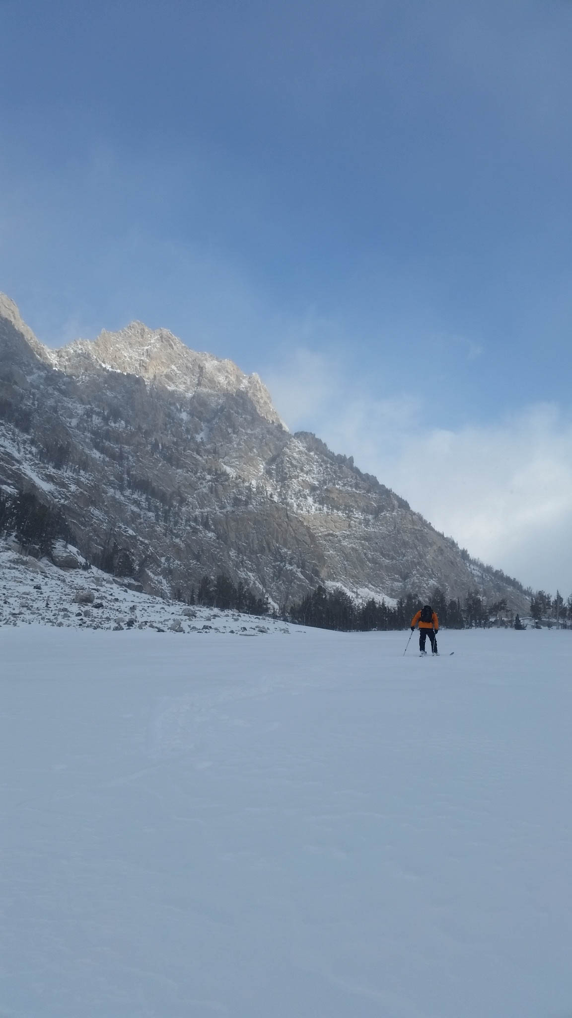 With around 10″ of snow and more on the way: Chase, Tim and I decided to venture into GTNP during a weather window to try and tackle Son of Apocalypse. It is one of many north facing couloirs off Prospector Mountain that end up in Death Canyon. We left town around 8:15am, delighted by the amazing weather and great visibility. We were moving from the Death Canyon parking area at 9am and made some good time up to Phelps Overlook. Here, we took off our skins and traversed right (south), following the summer trail until we crossed onto the large field to the west of Phelps Lake.