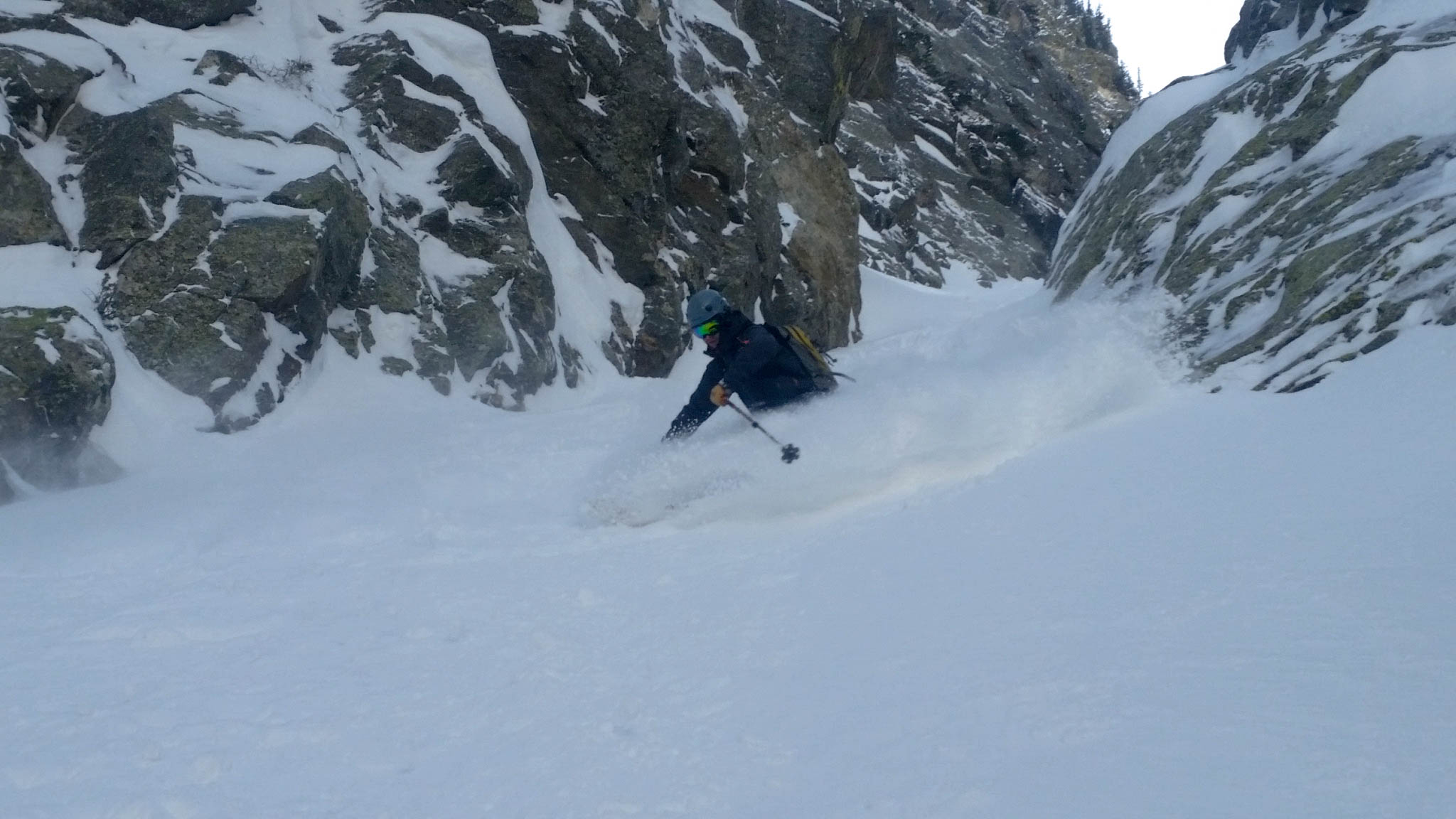 From here, the couloir eventually pinched into a fairly tight choke toward the bottom of the run, before opening up to the exit apron. We skied down to the pinch and passed through without incident.