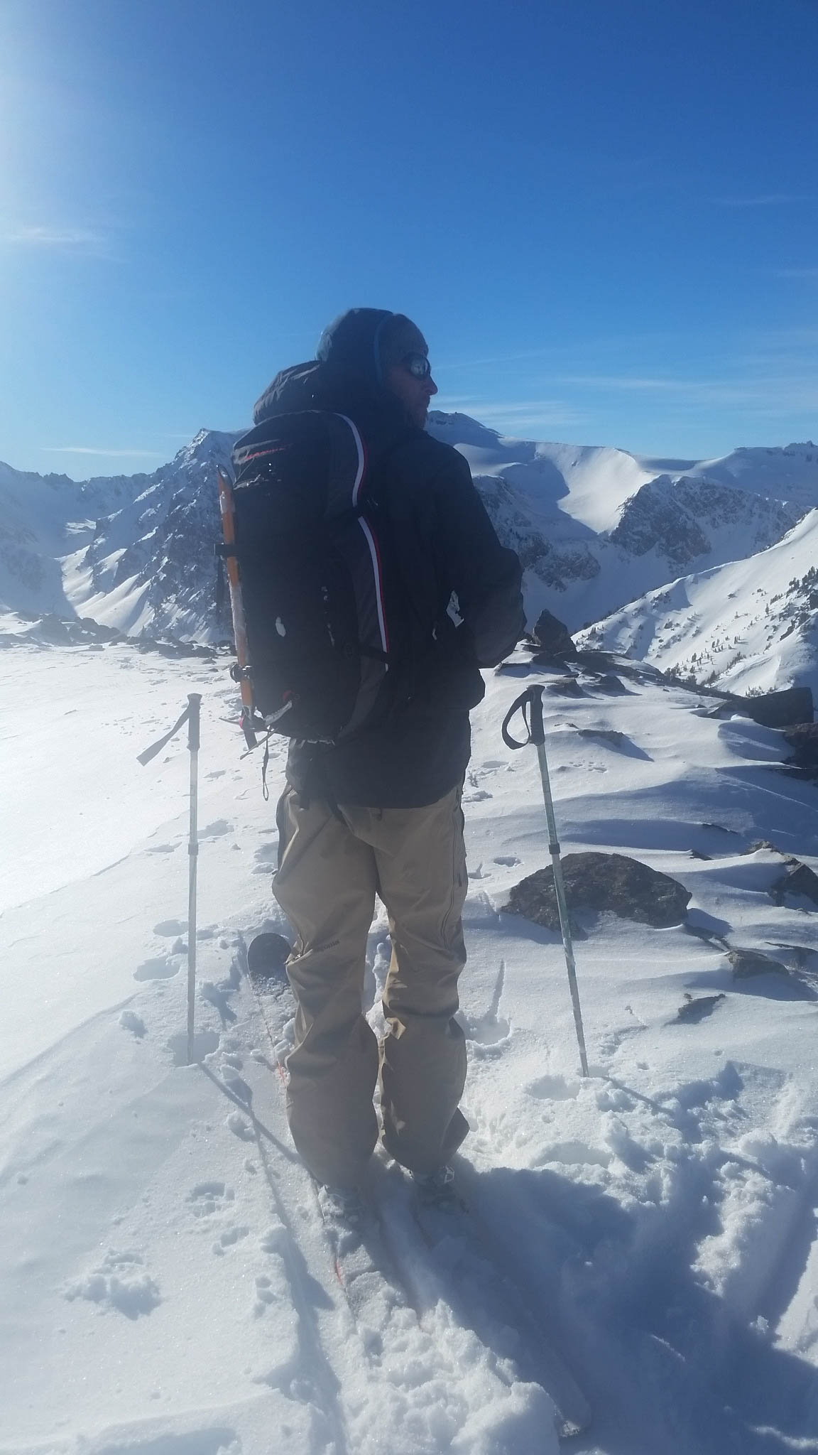 After cleaning off our skis (the slush freezes quickly) we ate some food and got our gear ready for the climb up the Skillet. It was around this time I realized that the handle of my Black Diamond pole was hanging on by a thread. I touched it and it fell off my pole….