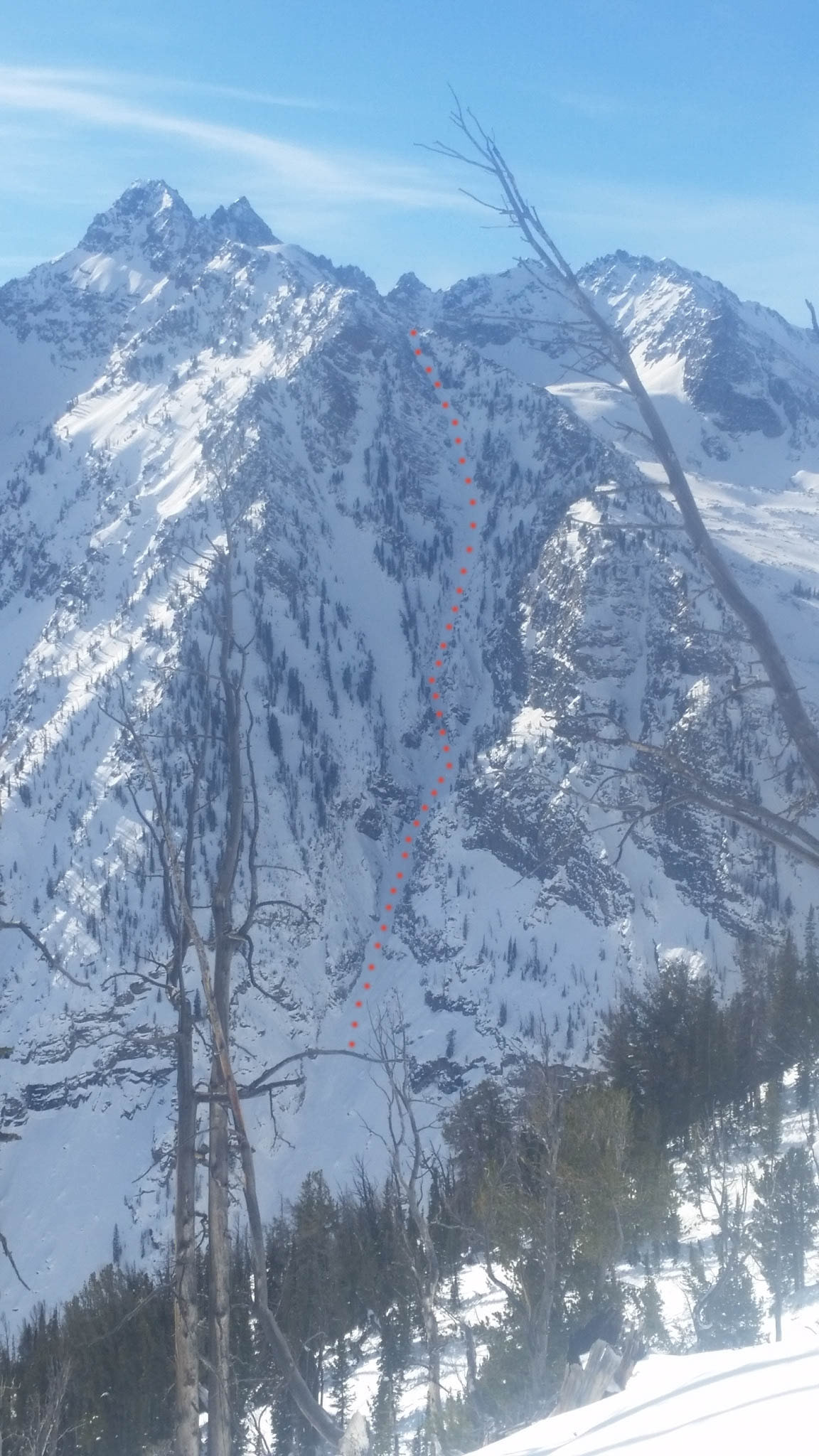 With all this in mind, we left Jackson at 5:15am and were moving from Colter Bay at 6:25am. It was dark, but I used my Suunto Traverse to make the way in the direction of the northern edge of the Skillet Couloir. We continued on for about an hour in the dark until the sun stared to shine through and at that point, we realized we were on target-heading right for the Skillet!